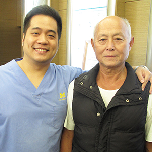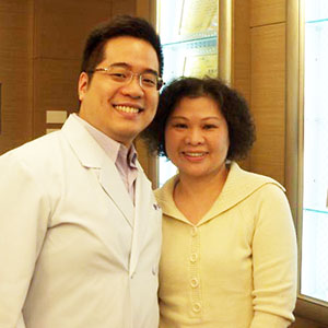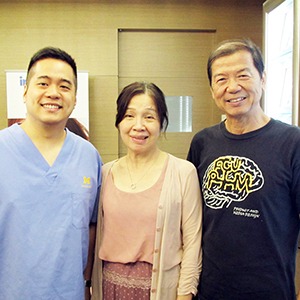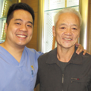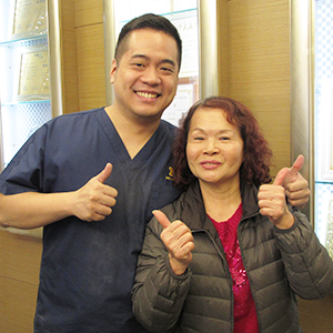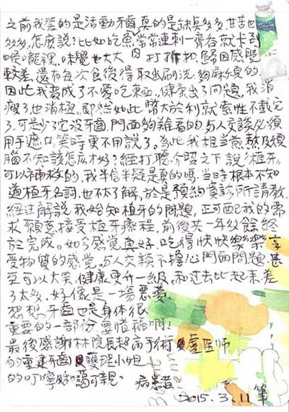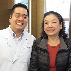 本人因罹患牙周病致牙齒脫落,曾數度重置假牙,亦無法平整咀嚼食物,常覺食不知味,深以為苦。兒媳一再遊說,並灌輸生活要有良好品質的觀念,推薦至聖偉牙科看診。