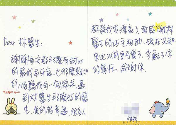 最後感謝林院長超高手術、盧醫師的重建牙齒,護理小姐的叮嚀和藹可親。