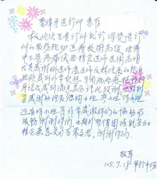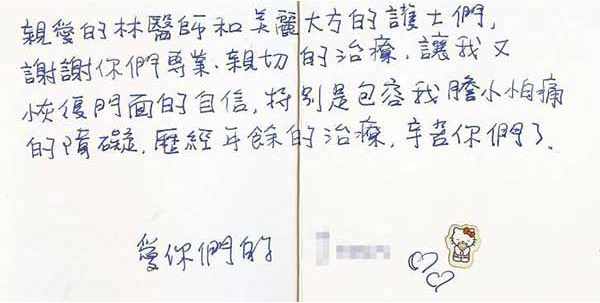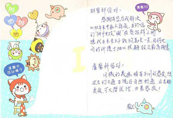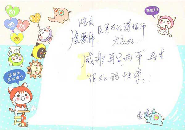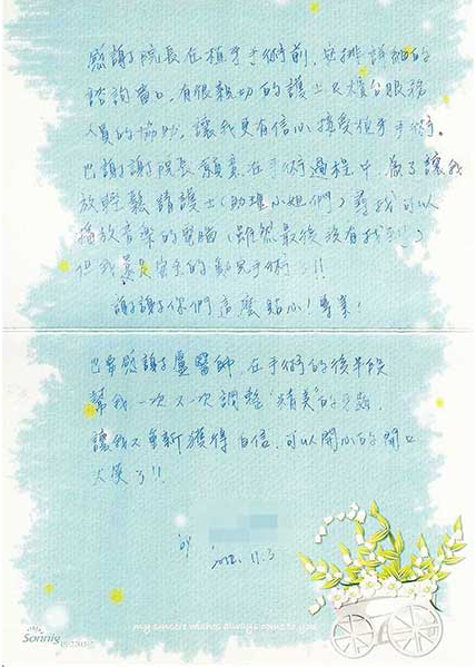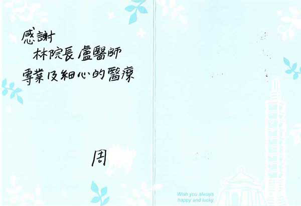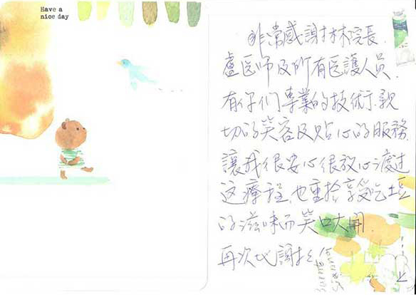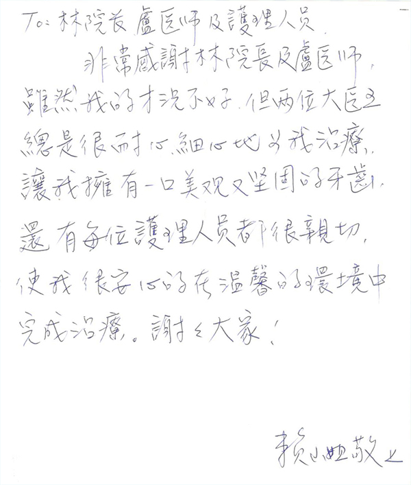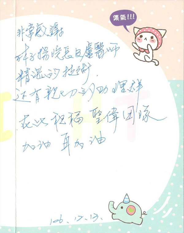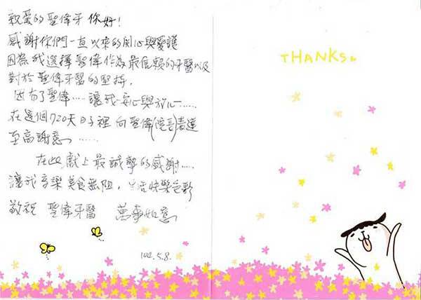 感謝您和所有可愛的護士們的用心和耐心醫治。