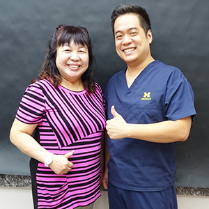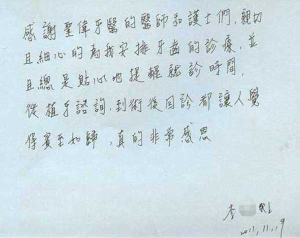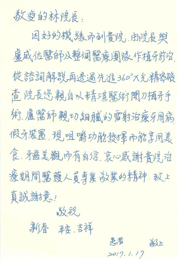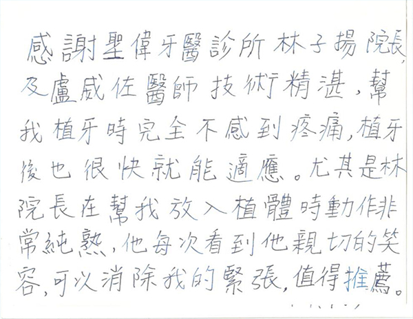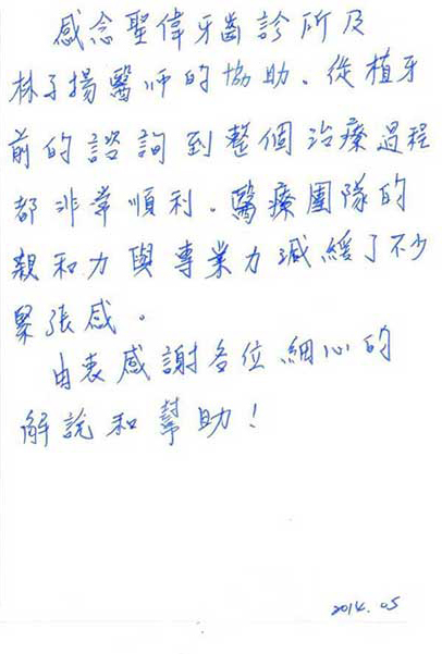 尤其感謝醫師及林院長的親自照顧,感到非常欣慰,牙周療癒、植種新牙,讓我感到滿意萬分,謹此致謝!也特別要感謝助理及諮詢小姐:廖小姐、陳小姐還有徐小姐等,非常感激妳們的協助與服務,謝謝妳們!也期盼聖偉團隊能更加精進為有需要者。