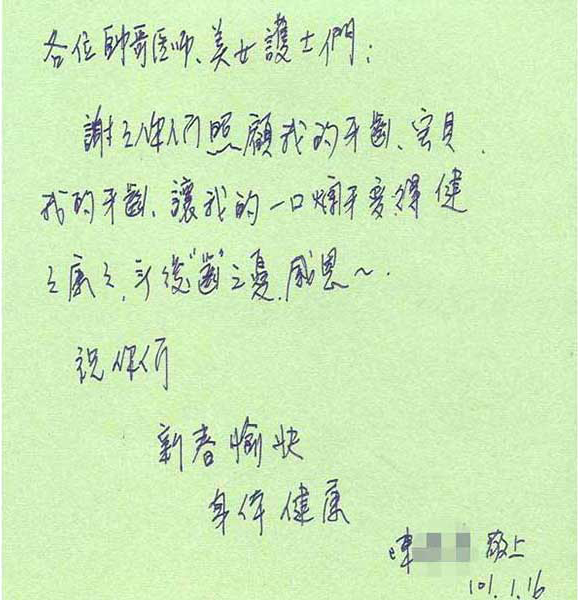 謝謝你們照顧我的牙齒、寶貝我的牙齒,讓我的一口爛牙變得健健康康,不再有〝齒〞之憂,感恩~祝你們新春愉快身體健康
