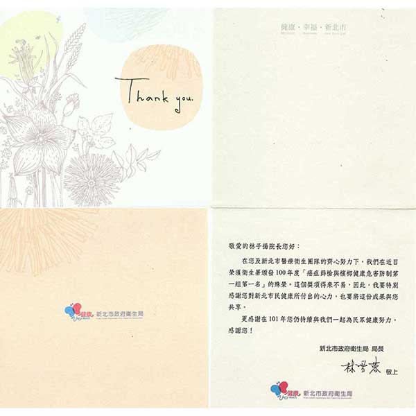 在您及新北市醫療衛生團隊的齊心努力下,我們在近日榮獲衛生署頒發100年度「癌症篩檢與檳榔健康危害防制第一組第一名」的殊榮。這個獎項得來不易,因此,我要特別感謝您對新北市民健康所付出的心力,也要將這份成果與您共享。更感謝在101年您仍持續與我們一起為民眾健康努力,感謝您!