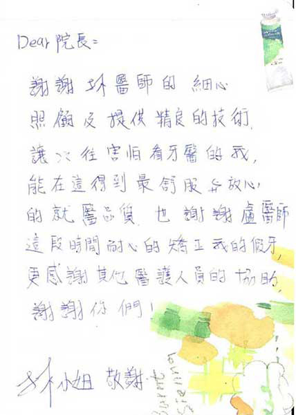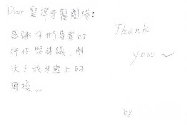 Dear聖偉牙醫團隊:感謝你們專業的評估與建議,解決了我牙齒上的困擾~Thank you~