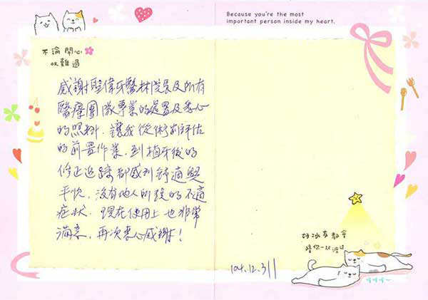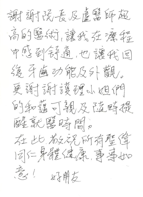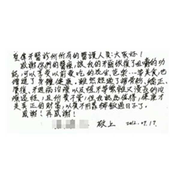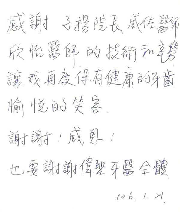 感謝您的妙手,讓不小心失去一顆牙的無齒之徒,能再次享受肆意咀嚼的快樂。