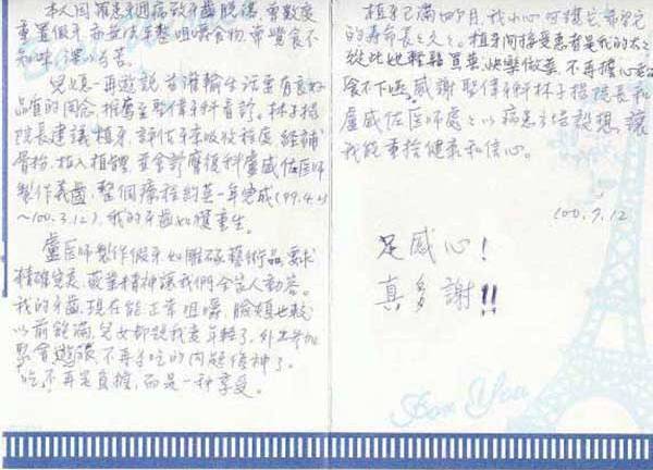 不知不覺過了一年多了,很高興的整個療程圓滿結束了,也很感謝林院長和盧醫師的付出,謝謝你們!
