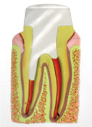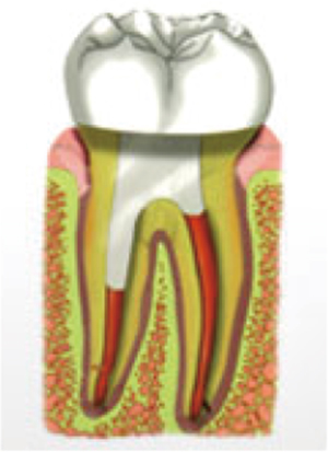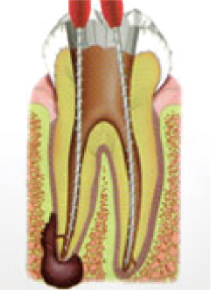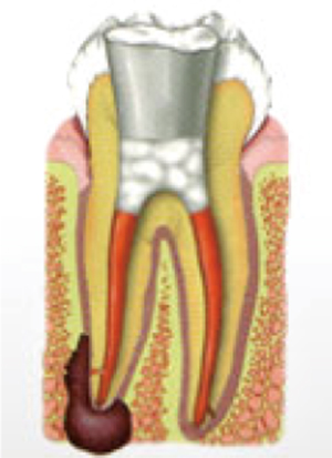 隨著牙齒牙釉質與牙本質等硬組織的破壞,口腔內數百種細菌便肆無忌憚地侵犯牙髓腔內的牙髓組織,輕者引起牙齒疼痛,嚴重者引起顏臉部腫脹,造成蜂窩性組織炎等細菌感染症狀。這時牙醫師便須施以「根管治療」,以排除根管系統內的細菌,恢復病患的口腔健康。