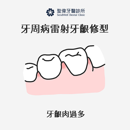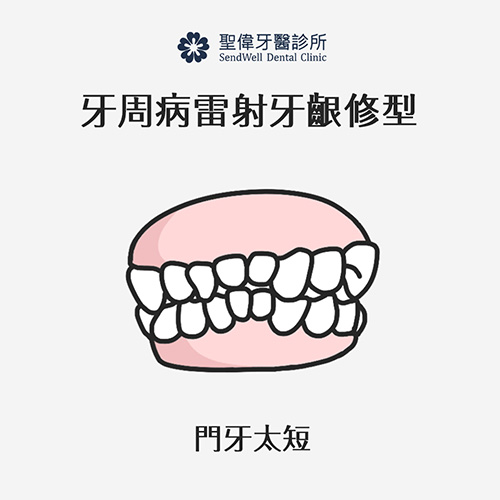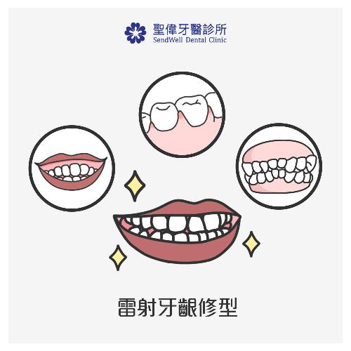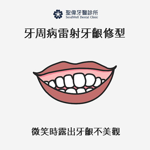 傳統電刀或手術方式處理牙齦修型,手術時間長、出血量多,利用雷射做牙齦修型,修出標準美麗的牙齦弧度,使牙齒呈現黃金比例。雷射牙齦修型手術方式,疼痛度大幅降低、傷口小、出血少、降低腫脹,恢復期短,術後可正常進食,治療過程快速舒適。 牙齦肉過多、門牙太短,或微笑時露出牙齦不美觀,讓你(妳)不敢自然大笑,都可選擇雷射牙齦修型來改善,雷射牙齦修型是安全性高的輕度外科手術,大多數民眾都適合。