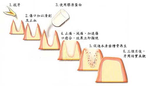 拔牙後的窩洞,建議填入膠原蛋白,防止齒槽骨嚴重吸收與凹陷,促進肉芽組織形成引導骨質增生及傷口疼痛、有止血的效果。