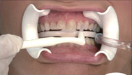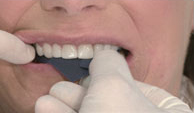 選擇適當的色階,將黏著劑塗在準備好的瓷牙貼片上,然後固定。
