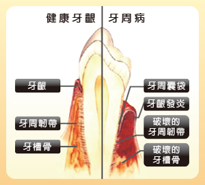 牙周病是發生在牙齦、齒槽骨、牙周韌帶的一種慢性的、持續性的細菌感染疾病。牙齦即是俗稱的牙肉,齒槽骨則是包圍在牙齒周圍,支持牙齒的骨質, 而牙周韌帶則是界在牙齒與齒槽骨之間一層薄薄的結締組織,具有緩衝咬合力的功能。